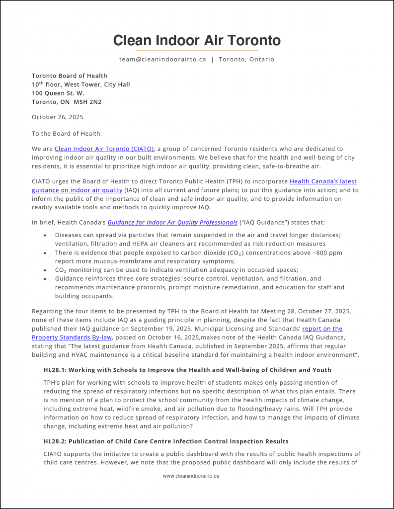 CIATO members rallied to speak before the Board of Health, on all 4 topics discussed at the October meeting: the plan to support school health, the dashboard for inspection results for child care centres, the plan to prevent RSV, and plans for managing public health during the 2026 FIFA World Cup. Experts including Joseph Fox, P.Eng., speaking on behalf of the Ontario Society of Professional Engineers, TDSB elected Trustee Michelle Aarts, and Dr. Joe Vipond, spoke with us to urge TPH to review and revise their plans in light of Health Canada’s new IAQ guidance.